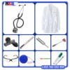 The 11 items in the set are as follows: (1) Stethoscope Litman Classic II, (2) MUAC Tape, (3) Reflex hammer; (4) Aneroid PALM Sphygmomanometer, (5) Tuning fork, (6) Examination pen torch, (7) Non mercury Thermometer,(8) Medical coat, (9) Theatre googles, and (10)Tape Measure retractable